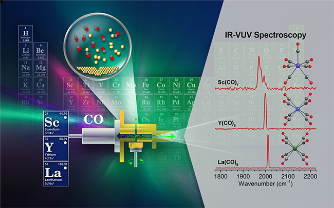 近日,中国科学院大连化学物理研究所分子反应动力学国家重点实验室团簇光谱与动力学研究组研究员江凌、副研究员谢华实验团队联合清华大学副教授胡憾石理论团队,采用自主研制的红外—极紫外(IR-VUV)红外光谱实验装置,在IIIB族过渡金属(Sc、Y、La)与CO的反应中发现了气相无限域中性七配位金属羰基化合物Sc(CO)7和八配位金属羰基化合物TM(CO)8(TM=Y,La),为设计具有独特性质的化合物及精准调控提供了新思路。