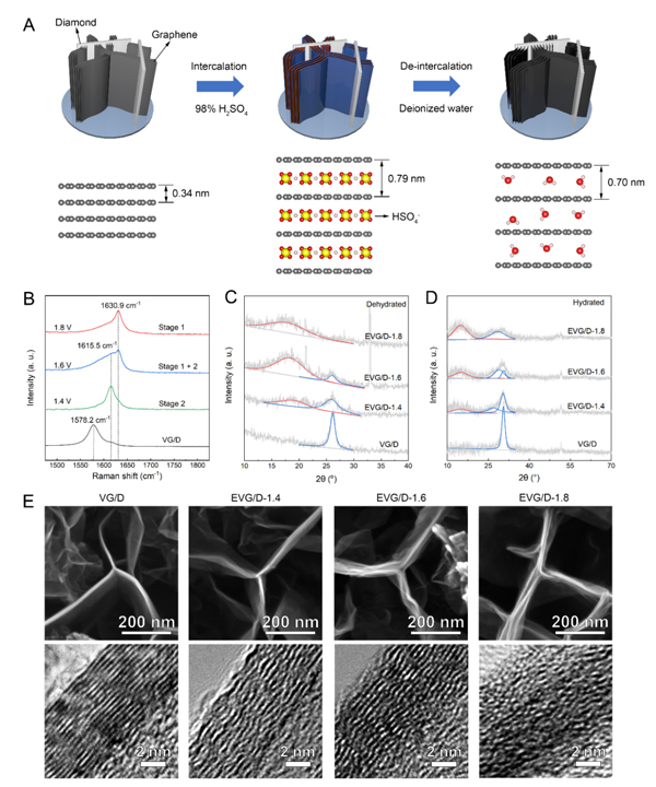 图1. 层状限域双电层膨胀垂直石墨烯/金刚石薄膜电极的制备和表征:(A)制备流程示意图;(B)石墨插层化合物的拉曼光谱;(C-D)XRD图谱;(E)SEM和TEM图像。