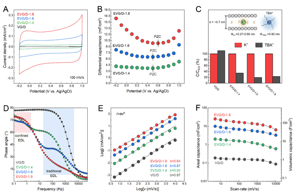 图2. 层状限域双电层膨胀垂直石墨烯/金刚石薄膜电极的电化学行为:(A)CV曲线;(B)微分电容-电极电势关系;(C)离子筛分效应;(D)EIS图谱;(E-F)动力学分析。