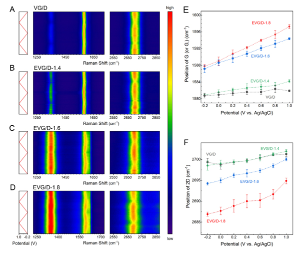 图3. 层状限域双电层膨胀垂直石墨烯/金刚石薄膜电极的原位电化学拉曼光谱:(A-D)原位电化学拉曼光谱;(E-F)拉曼特征演变幅度分析。