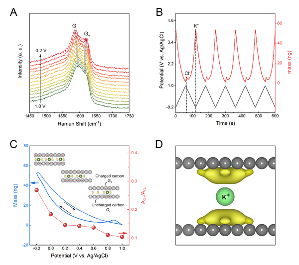 图4. 层状限域双电层电容的储能机理分析:(A)拉曼光谱中的G峰劈裂;(B)电化学石英晶体微天平分析;(C)电极质量变化和拉曼特征变化的关联性;(D)DFT-RISM计算获得的图像电荷分布。