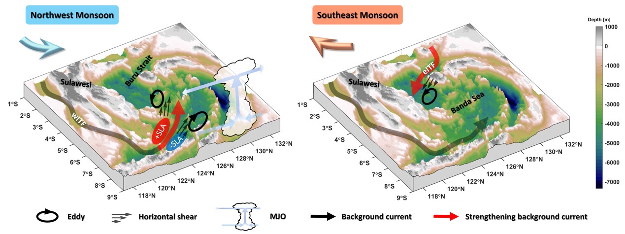 班达海地处印度尼西亚东部,是全球海洋大输送带的热带回流分支——印尼贯穿流(ITF)的关键通道。ITF的东分支与西分支在此交汇,使得北太平洋水团和南太平洋水团强烈混合。同时,班达海具有丰富的中尺度涡旋活动,强劲的涡旋会延长海水的停留时间进而允许混合过程来改变水团特性。然而,对于班达海涡旋活动季节变化及其驱动机制的认识尚不清晰。