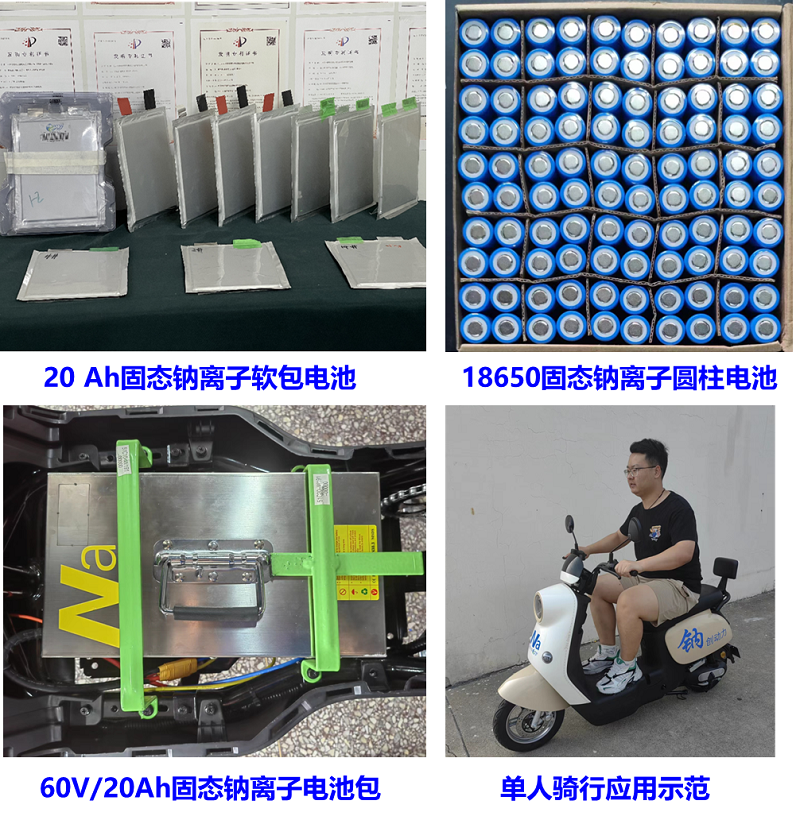 基于上述研究基础和技术积累,经过十余年的努力,崔光磊研究员带领的固态能源系统技术中心成功研制出低成本、高安全、高性能的固态钠离子电池。目前研发的固态钠离子电池电芯能量密度超140 Wh/kg,电池模组比能量密度超110 Wh/kg;具有超高安全性,可以通过针刺测试,不冒烟、不燃烧、不爆炸,已实现在二轮电动车的示范应用(图2)。未来,该团队将按照不同应用场景,重点瞄准低速电动车、新能源汽车48 V电源系统、家庭储能等领域,持续开发满足市场系列钠离子电池关键材料和核心技术。