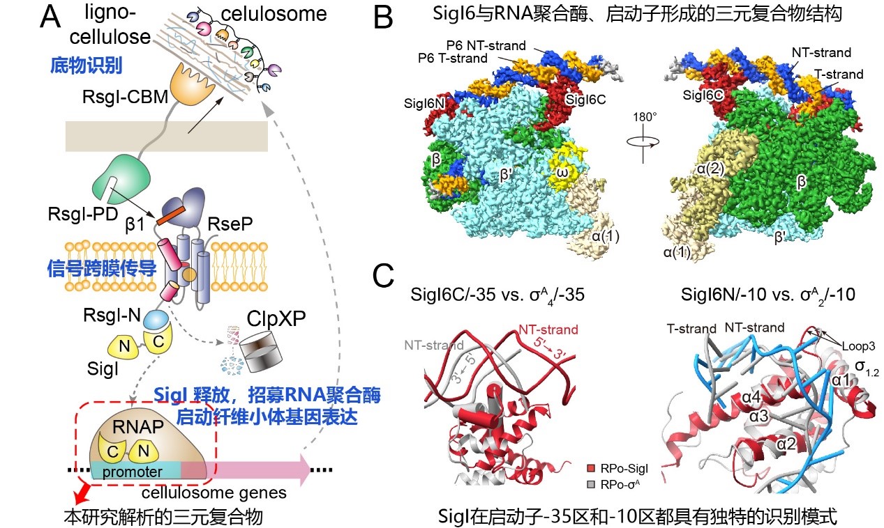 图1. 通过结构解析揭示SigI因子识别启动子的机制。(A)SigI-RsgI通过感应底物调控纤维小体转录的机制。(B)包含SigI6的转录开放复合体的冷冻电镜结构。(C)SigI6对启动子-35和-10区的识别方式。