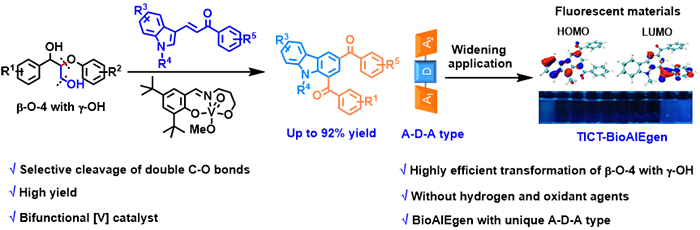 本工作中,研究团队利用希夫碱钒基催化剂,发展了一条通过断裂木质素 -O-4带 -OH模型化合物C-O键制备咔唑衍生物的新路线,目标产物收率达到了92%。该反应体现了底物普适性,含不同官能团的 -O-4带 -OH模型分子,以及带不同官能团的吲哚烯酮底物都可以转化为目标产物。此外,该团队通过控制实验与DFT计算相结合,确定了反应路径与催化剂对木质素的C-O键断裂的反应机理。在此基础上,该团队还研究了咔唑衍生物的光学性质,发现了基于咔唑的电子供体(Donor)能力和由这种独特的合成方法产生的苯甲?;哂械缱邮芴澹ˋcceptor)行为,以及三角形A-D-A骨架的建立使得咔唑分子具有扭曲的分子内电荷转移(TICT)-AIE性质等。