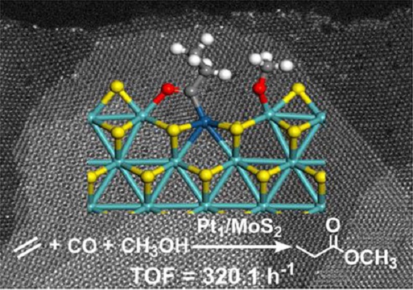 单原子催化剂作为一种特殊的无有机配体的单核多相催化剂,有望为传统均相催化的羰基化反应带来新的机会。本工作中,张涛、王爱琴团队研制了一种MoS2纳米片负载的Pt单原子催化剂Pt1/MoS2,其中Pt单原子和近邻配位不饱和的Mo原子组成Mo-S-Pt-S-Mo结构。得益于Pt单原子和载体的协同作用,Pt1/MoS2可在不添加酸助剂的条件下催化乙烯羧甲酯化反应,TOF值达320h-1,可媲美均相催化剂,而且具有优良的选择性和循环使用性能,在TOF值150h-1反应条件下选择性达到91%,且循环使用4次以后TOF值维持在90h-1,且无金属流失。该工作为推动烯烃羧酯化反应的多相化提供了新思路。