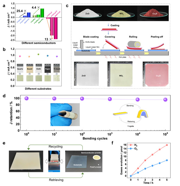 该液态金属镶嵌半导体颗粒的新型仿生人工光合成膜制备技术具有普适性好、膜结构稳定性高、易于规?;驮牧弦谆厥盏扔攀?。利用商业化半导体颗粒(如ZnO、WO3和Cu2O等)结合通用辊压技术,可实现不同半导体光活性薄膜在各种基体上的规模化制备,所获得的颗粒嵌入式薄膜的活性均显著优于传统方法获得的对照样品。在柔性基体上集成的薄膜在大曲率弯折10万次以上仍可保持95%以上的初始活性。此外,利用简单的热水超声处理,即可将半导体颗粒、低温液态金属以及基体进行分离回收再利用,且回收再集成制得的光活性薄膜表现出与原始薄膜近乎相同的活性(图5)。