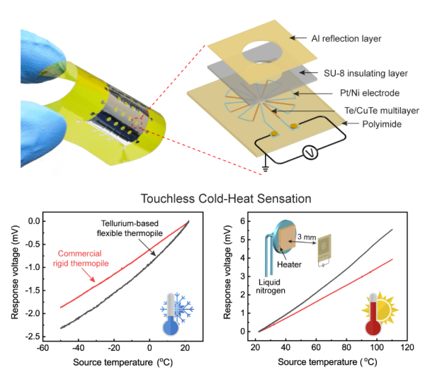 近日,中国科学院大连化学物理研究所催化基础国家重点实验室热电材料与器件研究组研究员姜鹏、副研究员陆晓伟、中国科学院院士包信和团队开发了柔性、可穿戴长波红外光热电探测器,并将其用于电子皮肤非接触温度感知。