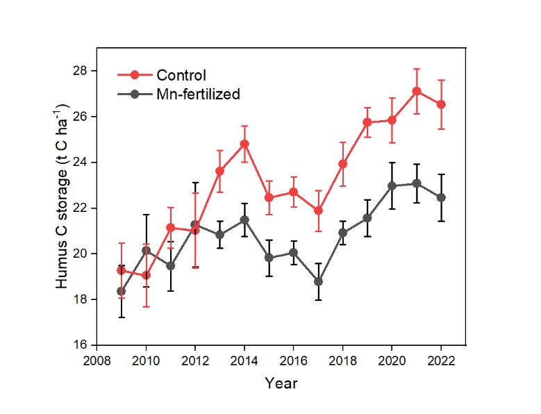研究揭示了外生菌根真菌通过调控土壤锰元素循环促进了落叶松人工林腐殖质层碳库积累的新机制。北方森林(Boreal forests)储存了全球陆地生态系统24%以上的碳库,其中大约64%储存于地下。其储存的碳库主要位于腐殖质层中,包含正在分解的凋落物和其它有机物质。Agaricomycetes是高纬度地区落叶松人工林土壤中普通存在的一类外生菌根真菌,Agaricomycetes特异性产生的锰过氧化物酶通过驱动锰氧化还原循环,可以把腐殖质层中可利用的二价锰离子(Mn2+)转化为活性三价锰离子(Mn3+),该活性三价锰离子与真菌分泌的草酸类螯合剂形成化合物,可穿透木质素和木质素类化合物的酚类结构,从而调控有机质分解和腐殖质层碳库积累?;诖思偕?,研究团队在大兴安岭寒温带落叶松人工林设置了长达14年的锰添加实验(图3),发现锰添加处理进行到第5年后,显著改变了外生菌根真菌的群落组成并增加了腐殖层碳库容量。本研究解析到的锰添加的滞后影响,可能是由于外生菌根真菌需要一定周期后才能适应锰有效性的增加和土壤环境的变化。