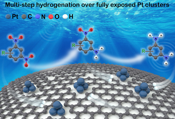 最近,中国科学院金属研究所沈阳材料科学国家研究中心刘洪阳研究员、刁江勇副研究员和博士研究生司阳等人与北京大学马丁教授、中国科学院山西煤化所温晓东研究员、香港科技大学王宁教授等团队合作,在富缺陷石墨烯载体表面精准构建了全暴露Ptn团簇催化剂,实现其高效催化2,4-二硝基甲苯多步加氢,并在亚纳米尺度下系统理解2,4-二硝基甲苯加氢的金属结构的依赖性。近日,该研究成果在《自然-通讯》(Nature Communications) 在线发表。