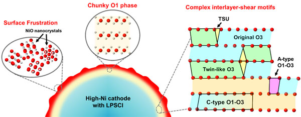 研究表明,全固态电池中的晶格失氧和局部应力耦合驱动的表面“晶格碎化”以及脱锂诱发的剪切相变共同导致了层状氧化物的结构性能退化。表面“晶格碎化”涉及纳米级多晶岩盐相的形成,这一失效模式系首次在层状氧化物正极材料中被发现。该研究还发现了区别于传统锂离子电池中层状正极的剪切界面新构型和大尺寸O1相的形成。这一研究拓展了层状氧化物正极的相变退化理论,有望为面向全固态电池的正极材料和正极/电解质界面优化设计提供重要理论指导。同时,该工作也凸显了先进电子显微学表征技术在解决能源领域核心科学问题中扮演的重要角色。