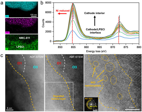 全固态锂电池以其高安全性和高能量密度有望成为超越传统液态锂离子电池的下一代电池技术。然而,电极材料(包括正极和负极)与固态电解质的界面不稳定性一直是困扰固态电池发展的瓶颈所在。例如,正极/电解质界面不稳定性诱发的层状氧化物正极(主流正极材料)结构退化是限制全固态锂电池性能稳定性的关键之一。特别是,在产业界不断提高层状氧化物正极中镍含量的背景下(电池能量密度与其镍含量成正比),高镍层状氧化物正极材料的本征电化学不稳定性导致的电池性能衰减显著加剧。在此背景下,深入认识正极/固态电解质界面不稳定性诱发的电池材料失效机制对于全固态电池材料的优化设计具有重要意义。