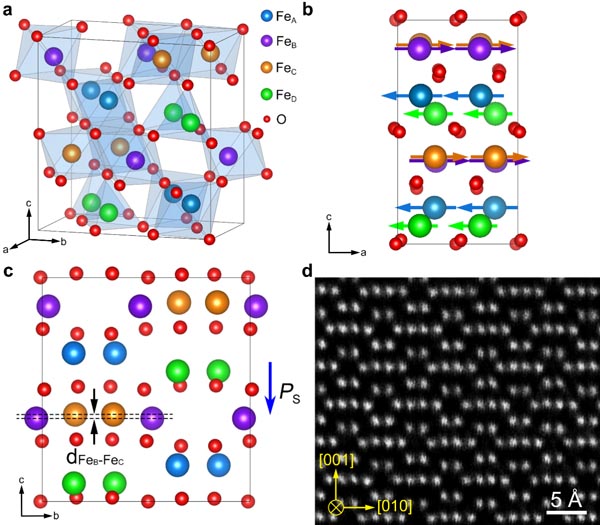 图1.(a) -Fe2O3的原子结构,(b) -Fe2O3的磁结构,(c) -Fe2O3的铁电极化,(d) -Fe2O3相沿[1 00]方向的HAADF像。