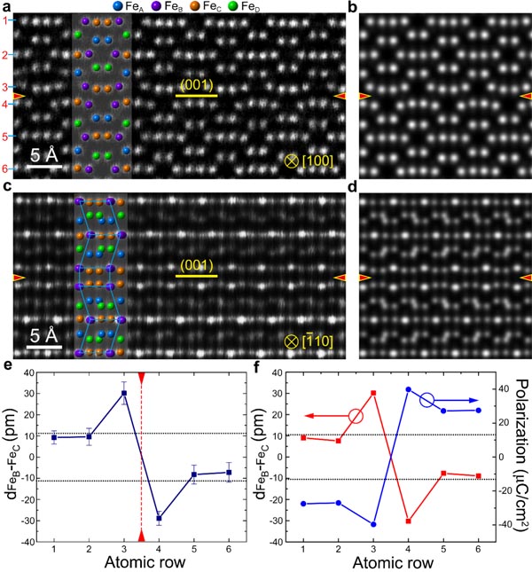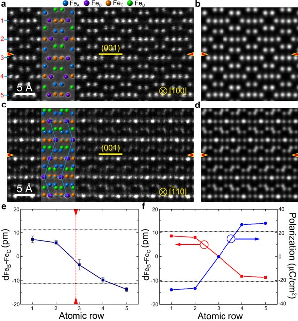 图2. (a,c)I型畴壁分别沿[100]和[1 00]方向的HAADF像,(b,d)对应的模拟HAADF像,(e)畴壁附近不同原子层的相对位移量,(f)计算得到的不同原子层的相对位移量和对应的铁电极化强度。I型畴壁处的铁电极化强度显著增强。