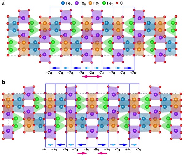 图4. 畴壁处铁电极化增强或减弱的物理机制。(a)I型畴壁的原子模型与束缚电荷分布,(b)II型畴壁的原子模型与束缚电荷分布。畴壁处的铁电极化行为受束缚电荷密度的调控。