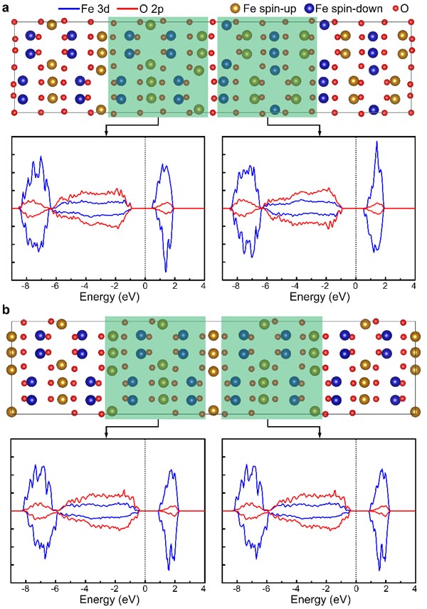 图5. (a)I型畴壁的态密度图,(b)II型畴壁的态密度图。I型畴壁两侧的磁矩为反平行排列,形成反铁磁性耦合;II型畴壁两侧的磁矩为平行排列,形成铁磁性耦合。