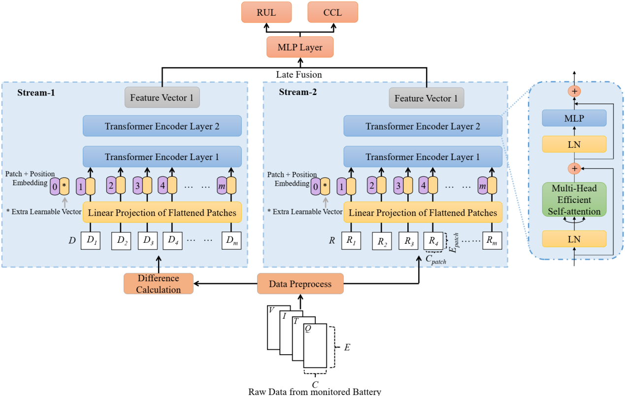 该研究提出了基于少量充电周期数据的深度学习模型。这一模型通过带有双流框架的Vision?? Transformer结构和高效自注意力机制,捕捉并融合多时间尺度隐藏特征,实现对电池当前循环寿命和剩余使用寿命的准确预测。同时,该模型在使用15个充电周期数据的情况下,将剩余使用寿命和当前循环寿命的预测误差分别控制在5.40%和4.64%以内。此外,在面对训练数据集未出现的充电策略时,该模型仍能够保持较低的预测误差,证明了其zero-short泛化能力。