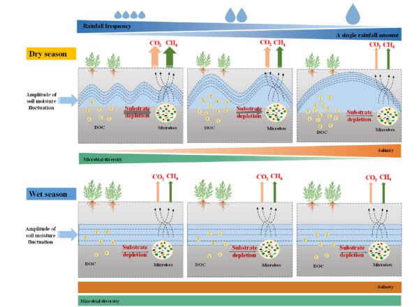 该团队基于降雨改变模拟控制实验平台,模拟黄河三角洲干旱季和湿润季的降雨频率即高频率降雨、中频率降雨和低频率降雨对土壤碳矿化CO2和CH4排放的影响。在干旱季,降雨频率减少降低了土壤CO2和CH4通量,这可能与微生物活性和多样性以及土壤水分和盐分等理化性质的变化相关。在湿润季,降雨频率处理对土壤碳矿化无显著影响,这可能是由于降雨前较高的土壤水分减弱了降雨处理对这些指标的影响。因此,该河口盐沼土壤碳矿化损失对降雨频率变化的响应具有季节依赖性。在未来气候变化的背景下,降雨频率向大降雨事件增加的趋势转变将放大表层土壤水盐变化,这对滨海湿地土壤碳稳定性和碳收支具有重要影响。