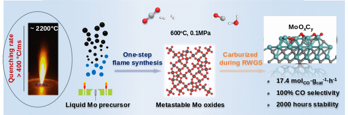 近日,中国科学院大连化学物理研碳资源小分子与氢能利用研究组研究员孙剑和副研究员俞佳枫团队在碳化钼催化CO2转化利用方面取得新进展,利用火焰喷射裂解法(FSP)一步合成了亚稳态不饱和氧化钼催化剂。该亚稳态结构的氧化钼无需碳化处理,可直接应用于逆水汽变换(RWGS)反应中,在反应气氛下迅速发生原位碳化,生成碳氧化钼活性相,在高空速的苛刻条件下仍展现出优异的催化活性和稳定性。该方法省去了繁琐的碳化制备过程,解决了传统的碳化钼催化剂在反应中易被氧化失活的问题。