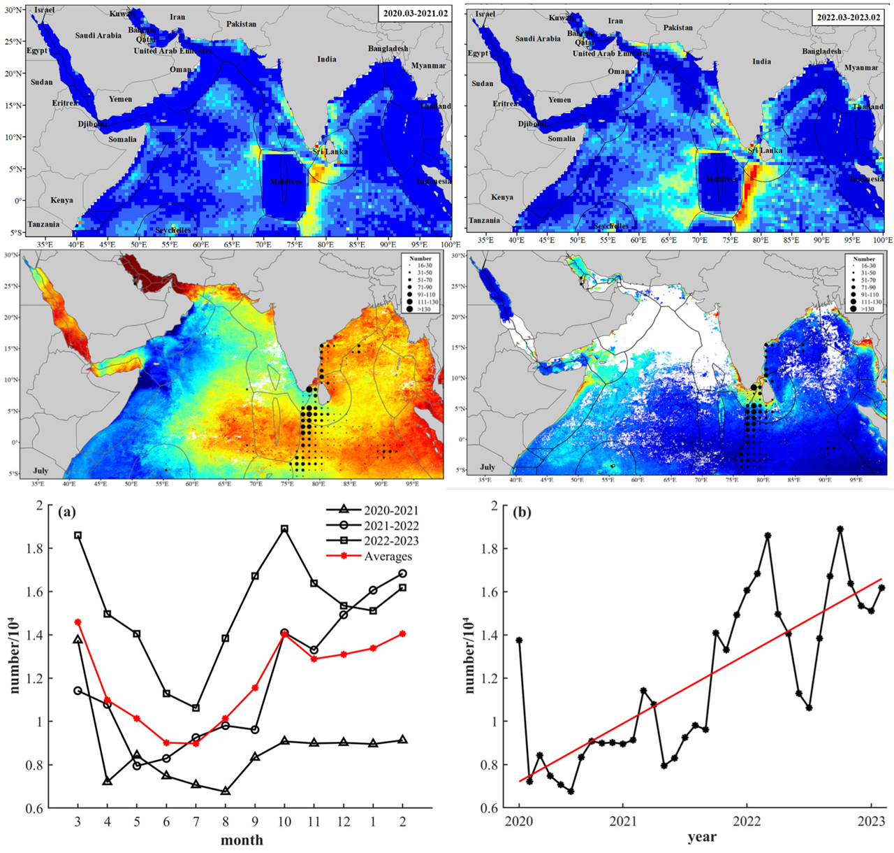 基于船舶AIS及卫星遥感数据在北印度洋的观测研究表明(Li et al.,?2024),北印度洋渔船高度集中在马尔代夫、阿曼等专属经济区外围印度洋公海、??撕O?、印度近岸海域,塞舌尔群岛海域及巴林湾的捕捞区和开放式养殖用海海域。北印度洋渔业活动有明显的季节性,每年7月渔业活动强度最低,与台风活动以及高温有关。受COVID-19疫情影响,2020年海上渔船数据急剧下降;随后至2023年,渔船活动热度逐年上升。