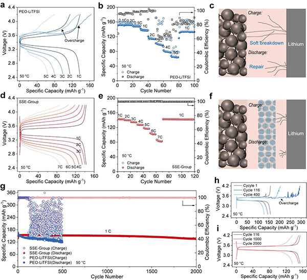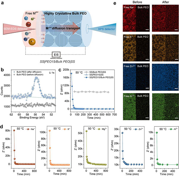 该研究发现了在高度结晶的PEO材料中,多种关键的能量存储离子,如Li+、Na+、K+、Mg2+、Zn2+和Al3+的离子自适应扩散现象(图1),在此基础上,发展了一种稳态测量方法(SSMM),克服了传统电化学阻抗谱法无法测量高结晶纯PEO材料中离子传导能力的局限性,从而量化了PEO块体材料在不同温度下的离子扩散系数。结果表明,PEO材料发生自适应扩散后仍然保持高结晶特性,同时形成连续的离子传输通道。利用这个发现,提出了基于高结晶PEO块体作为中间层的多层电解质膜组策略,有效抑制了由锂丝生长引起的电池软短路,实现了优异倍率和循环性能的固体电池(图2)。这些发现深化了对高结晶聚合物中离子传输机制的认识,为开发更安全、更高效的能源存储系统提供了新见解。