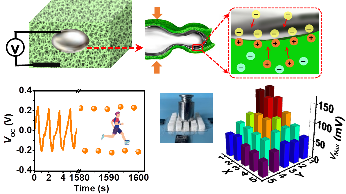基于液态金属与多孔离子凝胶动态双电层的机械能产电机制及功能示意图