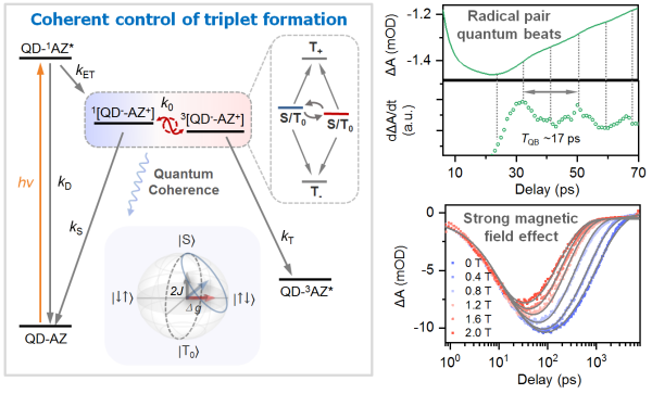 近日,中国科学院大连化学物理研究所研究员吴凯丰与副研究员朱井义团队在光化学与光物理交叉领域中取得进展。该团队直接观测到量子点-有机分子构成的杂化自由基对的量子相干特性,实现了三线态光化学产率的高效磁场相干调控。
