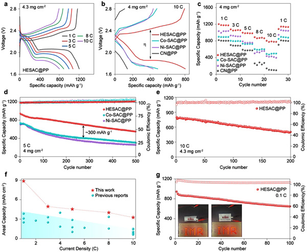 该研究发现并验证了不同中心金属原子间存在非键合作用的长程相互作用,作用范围在亚纳米距离内(图2)。这种长程相互作用影响中心金属原子的d电子占据状态,导致非典型价态。熵的增加进一步促进了中心金属原子中d电子和基底碳原子中π电子的重排。根据这些新认知在第四周期过渡金属中筛选出了五个潜在的高性能中心金属原子(Mn,Fe,Co,Ni,Cu),基于此设计的高熵单原子催化剂可有效地调节硫化物的吸附和转化反应动力学,同时提高被吸附硫化锂的电子导电性。所组装的锂硫电池在10 C的高倍率下具有800 mAh g-1的初始容量,并可稳定循环200圈以上(图3)。这一研究成果为单原子催化剂的进一步发展提供了重要的理论支撑,并有望推动高比能锂电池技术的突破与创新。