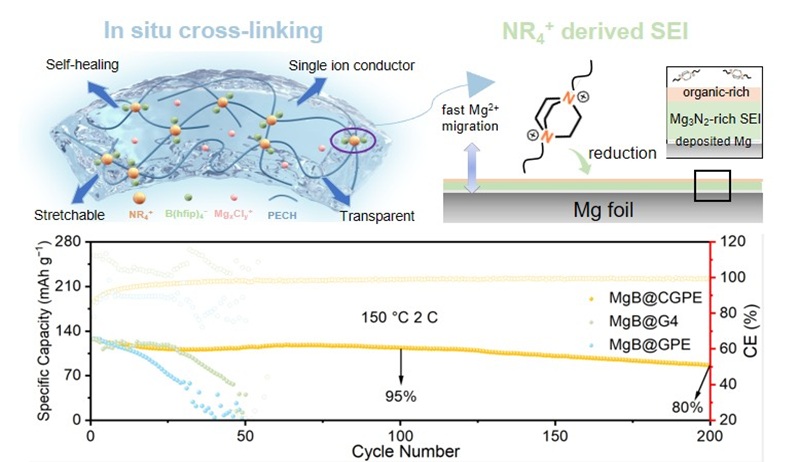 近日,青岛能源所固态能源系统技术中心在高温镁金属电池聚合物电解质研究方面取得重要进展。研究团队在新型镁电池聚合物电解质开发及镁金属负极界面构筑等研究基础上,选用具有高热稳定性和优异镁负极兼容性的聚环氧氯丙烷进行改性,并引入双官能团小分子季铵化交联剂的策略,成功实现了聚环氧氯丙烷的原位交联,并在其中引入季铵根官能团。研究发现,原位生成的季铵根官能团具有较低的最低未占分子轨道(LUMO)能级,可优先在镁金属负极表面发生分解,进而形成富含Mg3N2的有机-无机复合固体电解质界面层?;诟玫缃庵侍逑底樽暗腗o6S8//Mg电池在150°C高温下表现出优异的循环稳定性,稳定循环超过200圈,容量保持率超过80%。此外,该电池还在滥用状况下展现出优异的安全性。该研究为高温镁金属电池的电解质分子设计及界面优化提供了新的研究思路,有望推动高温镁金属电池技术的发展。
