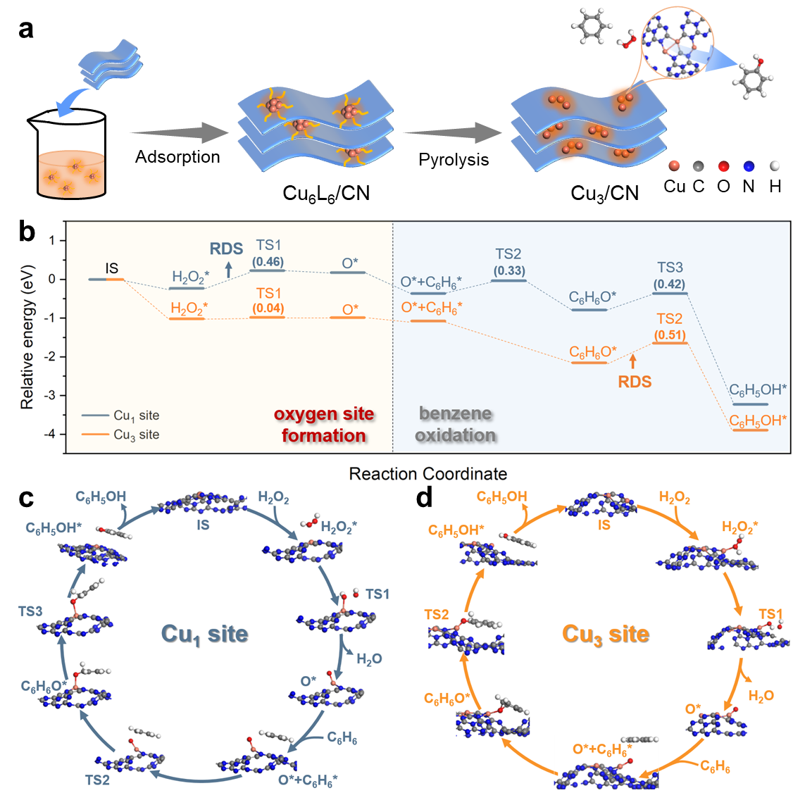 3.?通过构筑Cu3团簇改善电荷转移:Cu3团簇的构建有效提高了Cu位点的d带中心,加速其与吸附H2O2之间的电荷转移,有利于Cu=O*关键氧化物种的形成。此外,Cu=O*中的O* 2p轨道和Cu的3d轨道在费米能级附近明显杂化,有利于C6H6O *中间体的形成。