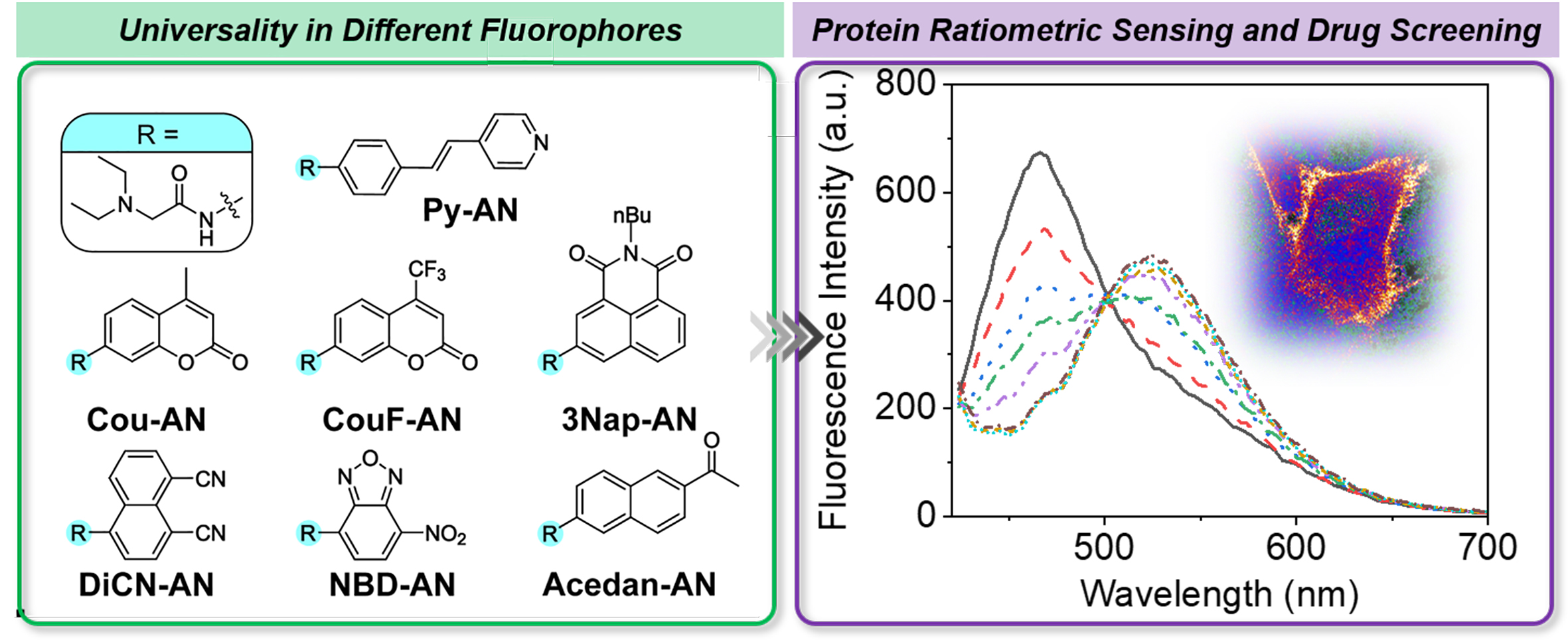 近日,中国科学院大连化学物理研究所研究员徐兆超、副研究员乔庆龙团队发现了一种新型“尾翼”介导的激发态分子内质子转移机制(ta-ESIPT),在对水/非水环境转变中表现出优异的ESIPT激活性能,并且在宽的极性范围内均可实现双荧光发射,被应用于活细胞内多种蛋白的比率识别、动态荧光成像与药物筛选。