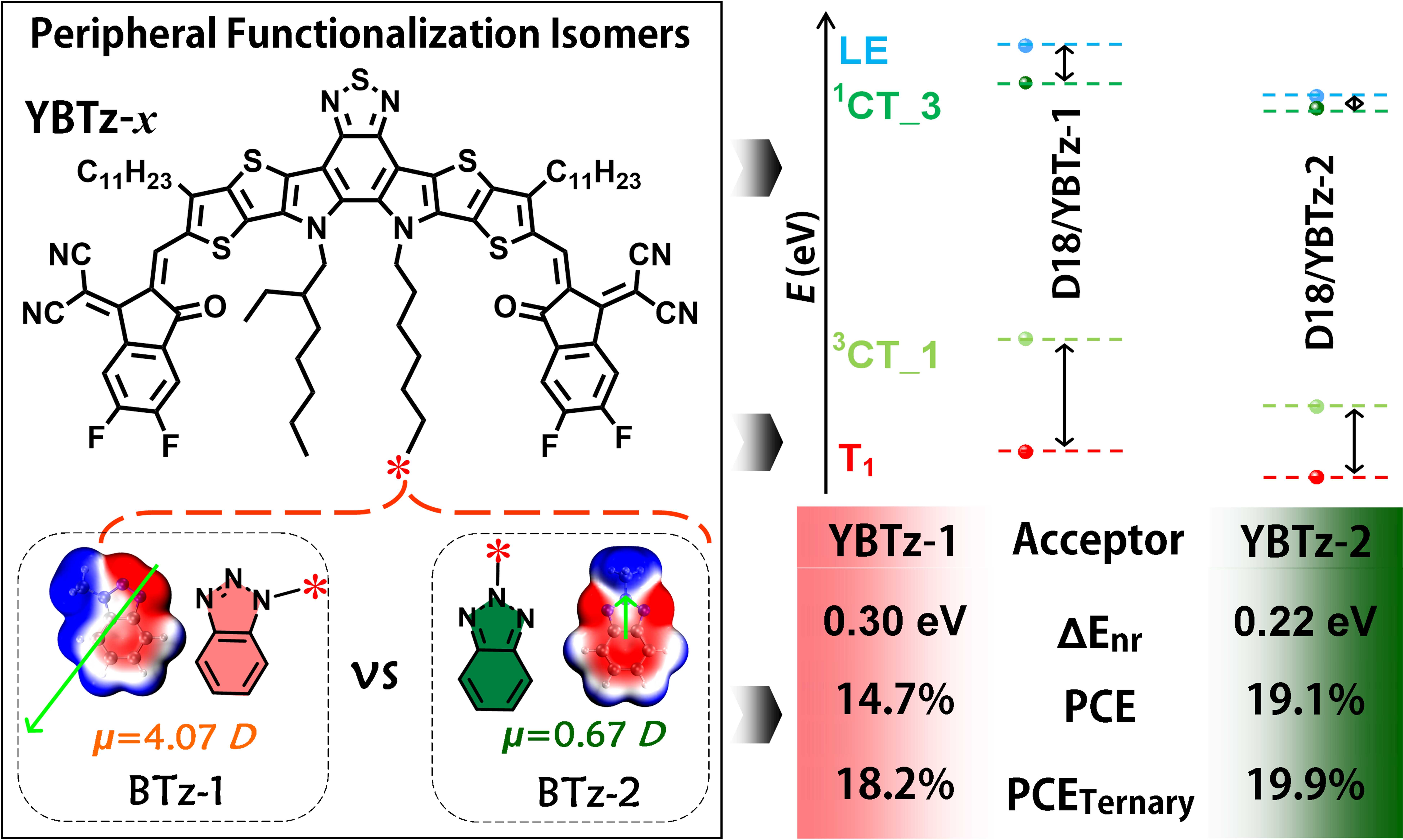 此前研究主要采用苯基作为外围功能基团调控有机共轭分子的聚集态。苯基作为一种整体呈现弱电负性的共轭基团,其更多发挥位阻作用,调节分子自组装,同时作为共轭平面参与分子间π-π作用构建及空间超共轭效应。为了进一步明确描述分子外围强电子效应的功能特性,研究团队引入具有强电负性的苯并三氮唑(BTz)进行外围功能调控,并基于一锅法得到了两类BTz异构体(图1)。研究结果不仅证实了外围基团对分子堆积、给受体相互作用及共混形貌的多重影响,还揭示了外围缺电子基团通过分子内相互作用诱导主骨架电子云分布重排,进而显著调控异质结能量景貌及非辐射能量损失(ΔEnr)的作用机制。由于ΔEnr的显著差异(0.30 eV vs 0.22 eV),两个外悬异构化的受体分子YBTz-1和YBTz-2表现出明显不同的光伏性能(14.7% vs 19.1%)。同时,YBTz-2受体的低非辐射能损特性使其在多组分器件中具有很好应用。将YBTz-2进行掺杂后,可以在保持开路电压基本不变的前提下,显著改善三组分异质结的纳米形貌,同时提高器件的短路电流密度和填充因子,实现了19.9%的高转换效率。