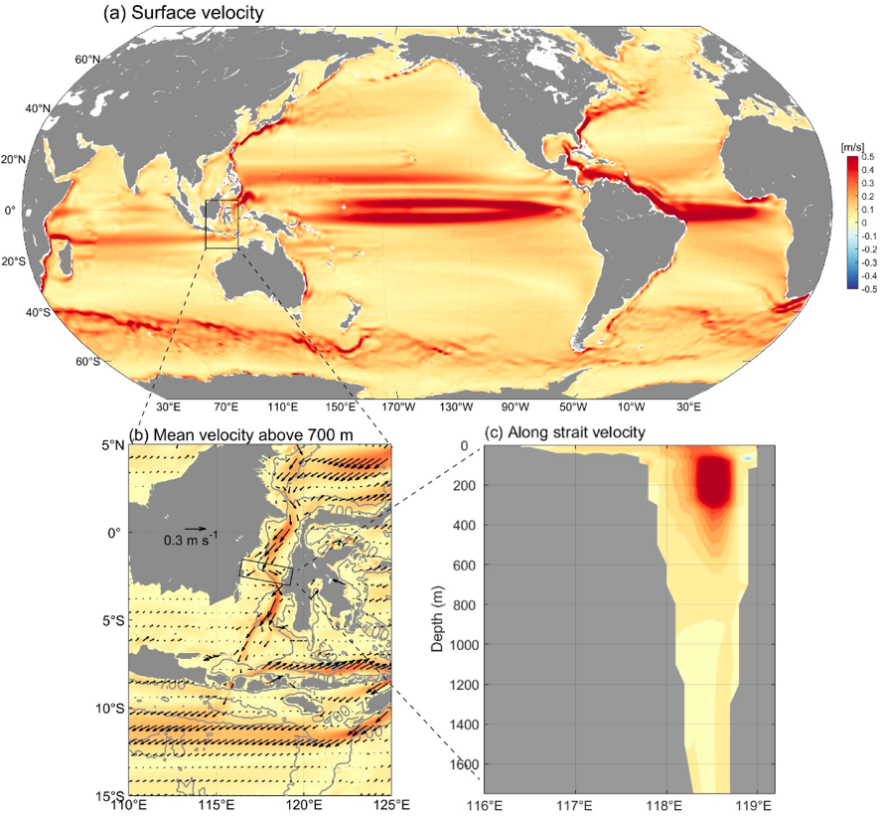 图1?0.1°高分辨率准全球海洋环流模式HYCOM模拟的全球表面流速(a)和印尼贯穿流结构(b、c)