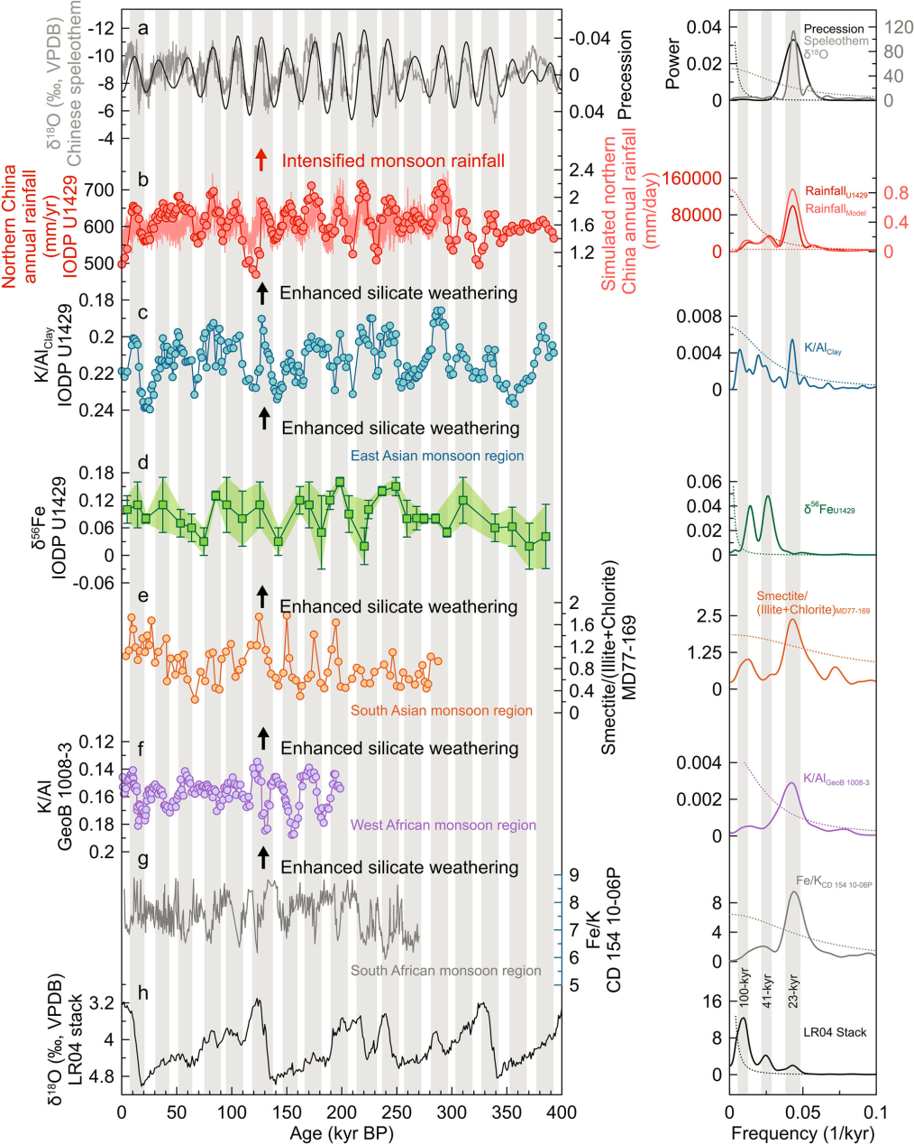 图1 晚第四纪以来全球硅酸盐风化记录以及降水演变周期的强度分布