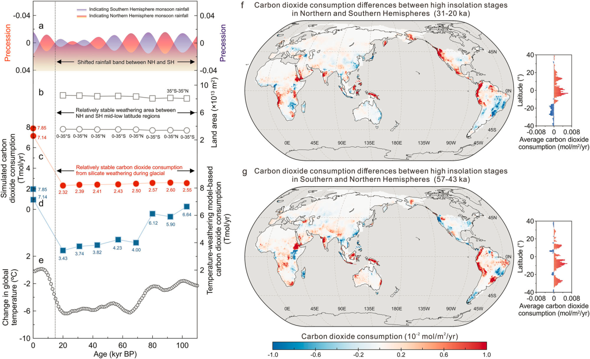 近日,中国科学院海洋研究所万世明团队在Nature旗下地学期刊Communications Earth & Environment(中国科学院一区top)发表了题为“Precessional variation of monsoon-controlled silicate weathering caused steady atmospheric carbon dioxide consumption during glacial periods”的重要研究成果。该研究基于海洋沉积物重建了过去40万年以来东亚季风区的硅酸盐风化演变历史,发现了季风降水对于陆地风化的强烈影响。季风降水带在南北半球间的往复移动引发的风化变化,使得第四纪冰期期间通过风化作用消耗的大气CO2的量维持相对恒定。