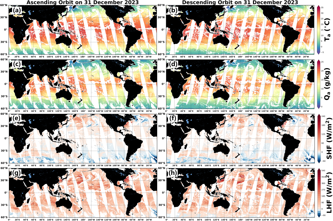 此外,研究团队基于MPFNet生成了覆盖11.5年(2012.7–2023.12)分辨率为0.25°的全球逐日Ta、Qa、SHF和LHF产品,为精细化海气通量估算、气候变化监测和极端天气预测提供了高质量数据支撑。