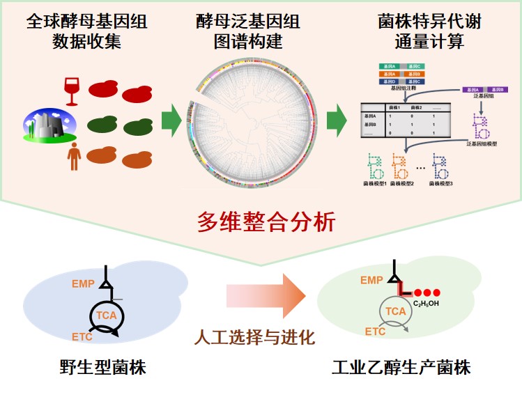 近日,大连化物所生物技术研究部合成微生物学研究组(1823组)周雍进研究员团队与上海交通大学鲁洪中副教授合作,在酵母系统生物学研究中取得新进展。研究团队通过整合分析全球1807株酿酒酵母菌株的基因组与生态位数据,构建了高覆盖度的酿酒酵母泛基因组及菌株特异性代谢模型,系统解析了酵母通过基因组精简与代谢重编程适应多样化环境的分子机制。