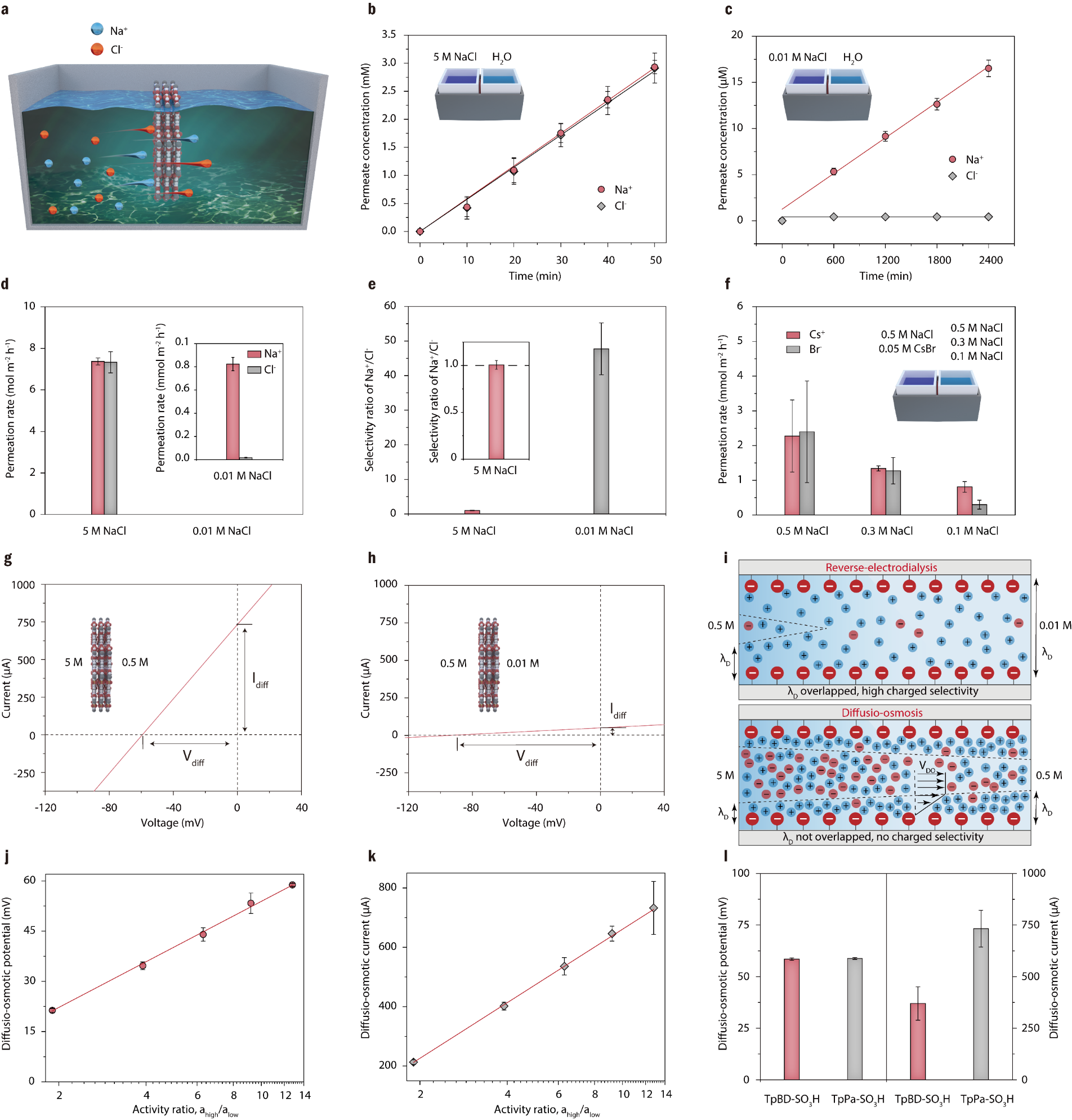 此前,利用单孔氮化硼纳米管、石墨纳米通道的研究已表明该机制有望实现超高功率密度的盐差能转换,但在膜尺度上仍缺乏相关研究。研究团队针对难以找到合适的膜材料匹配该机制开展研究,发现利用磺酸共价有机框架(COF)膜致密分布的磺酸基团、垂直排列的孔道结构,可以实现基于扩散-渗透机制的可规?;尾罘⒌纭?/span>