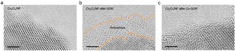 图2. Cu2+抑制催化材料表面非晶化过程的TEM图。(a) Co3O4的TEM图;(b) 经过常规GOR反应后Co3O4的TEM图;(c) 经过Cu-GOR反应后Co3O4的TEM图。