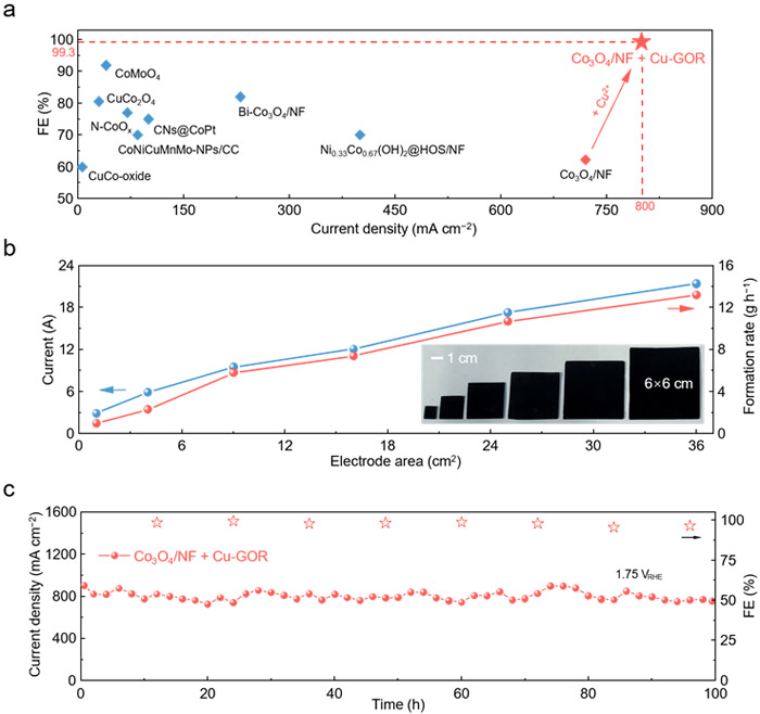 针对该挑战,中国科学院金属研究所太阳能与氢能材料研究团队提出了一种通过引入Cu2+抑制过渡金属氧化物表面非晶化的新策略(Cu-GOR)。相关研究结果表明,在电解液中添加微量Cu2+(相当于反应物浓度的1%),利用Cu2+/Cu+在电催化氧化过程中的可逆氧化还原,可有效维持催化材料晶体结构的稳定性,抑制过渡金属氧化物催化材料的表面非晶化过程。以泡沫镍负载Co3O4催化材料为例,在800 mA cm?2的工业级电流密度下,Cu2+的引入使目标产物甲酸的法拉第效率从62.2%提高至99.3%,性能显著优于已报道的催化材料。同时,该催化材料和反应体系易于放大,6×6 c㎡电极材料的甘油氧化产物收率达到13.2 g h?1,稳定性超过100小时。该策略还可扩展至其他过渡金属氧化物(如镍基材料)及多种生物质电氧化反应体系(如5-羟甲基糠醛电氧化),为推进生物质电催化技术在绿色氢能产业中的应用提供了新思路。