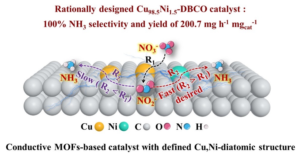 近日,大连化物所太阳能研究部太阳能制储氢材料与催化研究组(DNL1621组)章福祥研究员团队联合计算和数据驱动催化研究组(511组)肖建平研究员团队,在双原子电催化剂(DACs)的理性设计与构筑方面取得新进展。研究团队基于具有优异导电性和水稳定性的金属有机框架材料(conductive MOF,cMOF),通过对铜-镍(Cu-Ni)双原子活性中心的精准调控,实现了在工业级电流密度下接近100%选择性地高效合成氨,并揭示了硝酸根电还原合成氨过程中的协同“接力催化”机制。