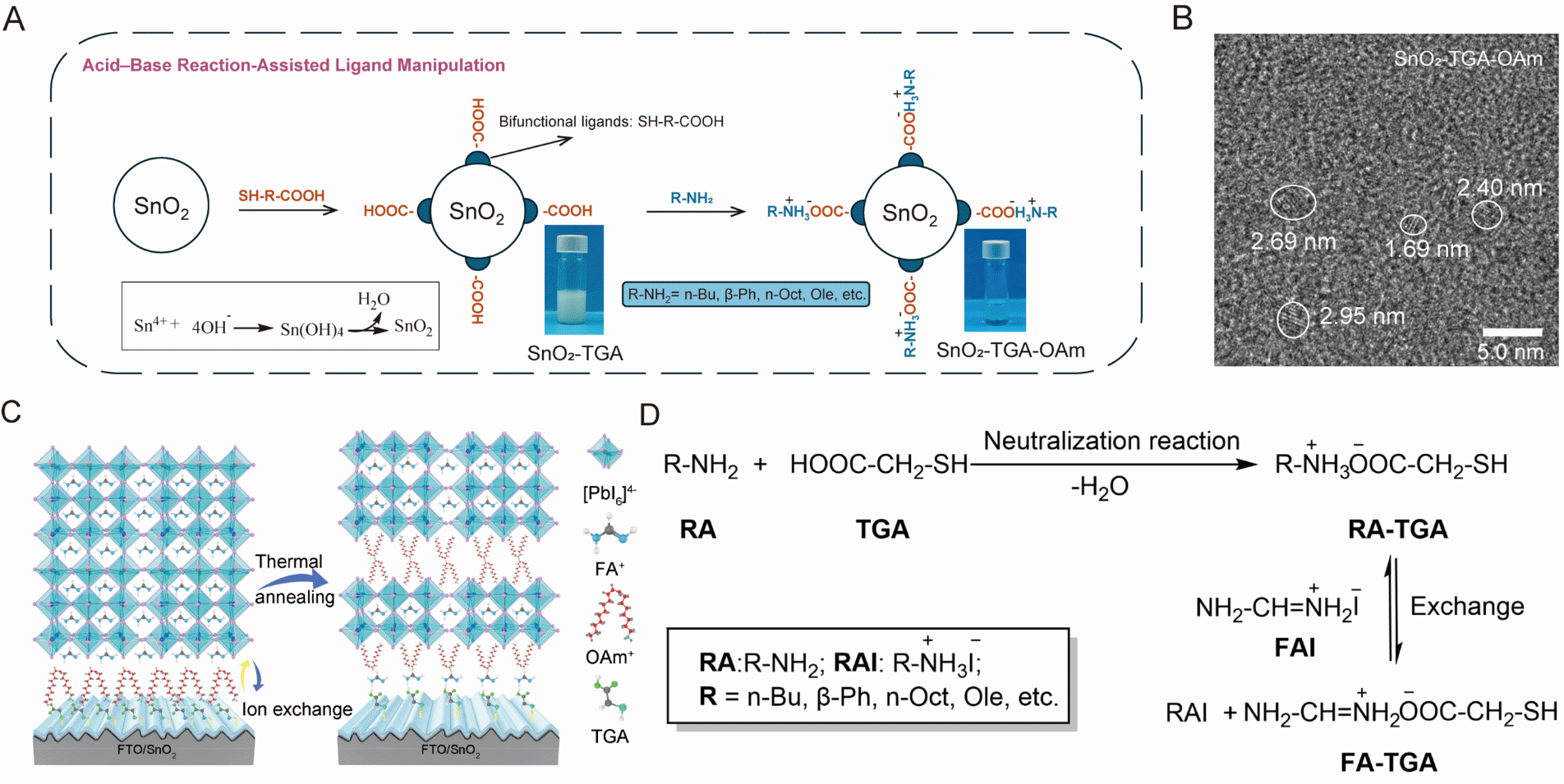 针对这一难题,青岛能源所钙钛矿组件技术研究组基于其在无机氧化物宽带隙半导体材料及器件研究的长期积累,通过配体分子表面调控,开发了一种调控氧化锡纳米颗粒表面配体作用力以界面处自发释放胺类配体形成2D/3D异质结的策略。研究团队依次将巯基乙酸(TGA)和油胺(OAm)接枝到二氧化锡纳米颗粒表面(SnO2–TGA–OAm),TGAOAm之间的强化学键确保了仅在钙钛矿薄膜的热退火过程中发生与FAI的阳离子交换,从而在钙钛矿薄膜底部界面处自发形成2D/3D钙钛矿结构。这种位置可控的2D/3D结构加速了钙钛矿相的形成,显著提升钙钛矿薄膜的结晶质量,使薄膜底层界面的缺陷浓度降低十倍以上。对应的钙钛矿太阳能电池展现出卓越的光电转换效率:26.19%(0.09 cm2)、23.44%(孔径面积21.54 cm2,认证效率为22.68%)22.22%(孔径面积64.80 cm2)。