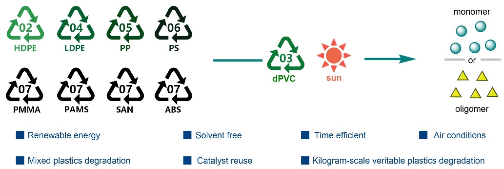 近日,大连化物所仿生催化合成研究组(211组)陈庆安研究员团队在聚烯烃塑料回收方面取得新进展,开发出以废聚氯乙烯(PVC)为光热试剂原料、以太阳能为能源的聚烯烃光热回收新技术,为聚烯烃光热回收提供了新思路。