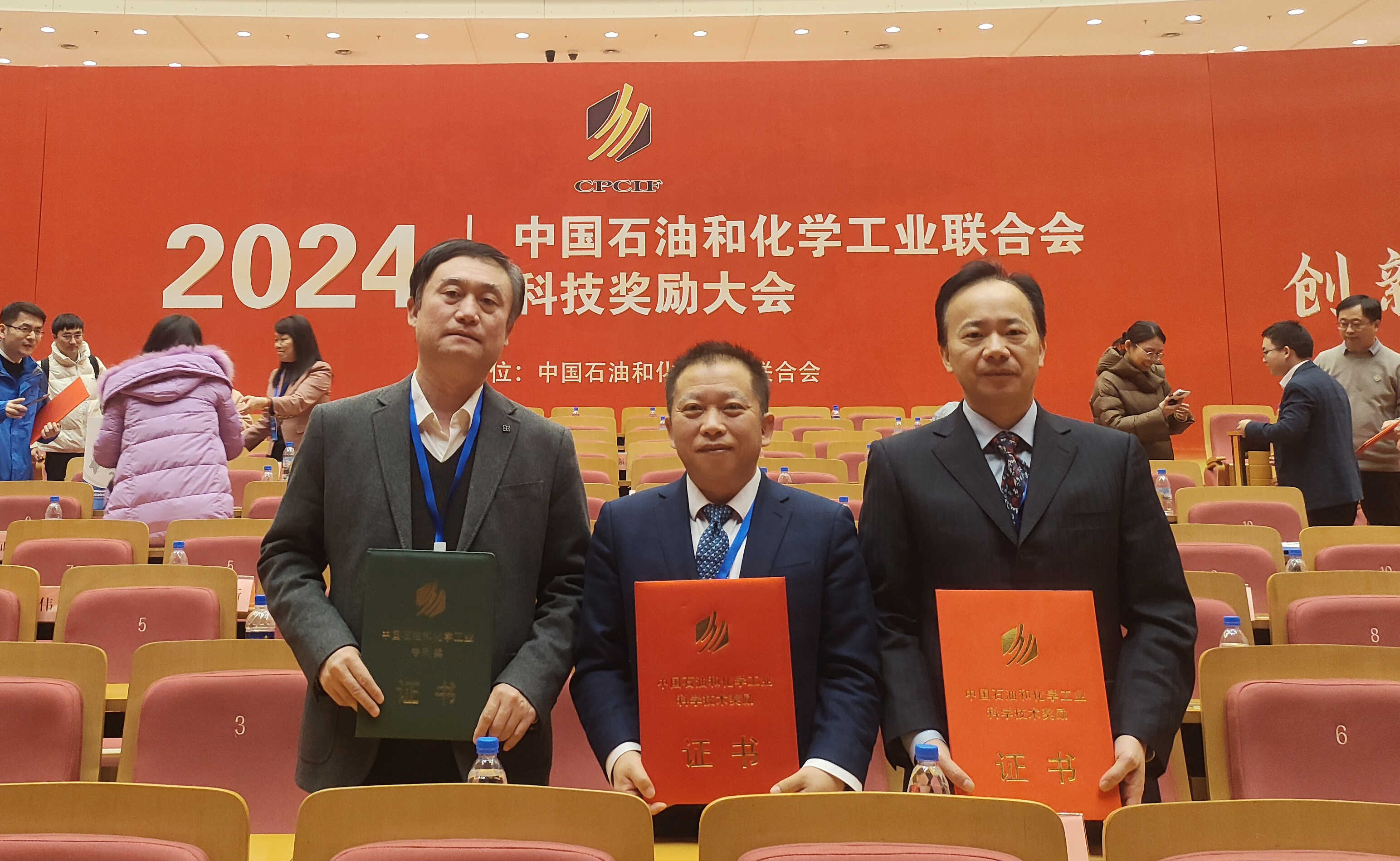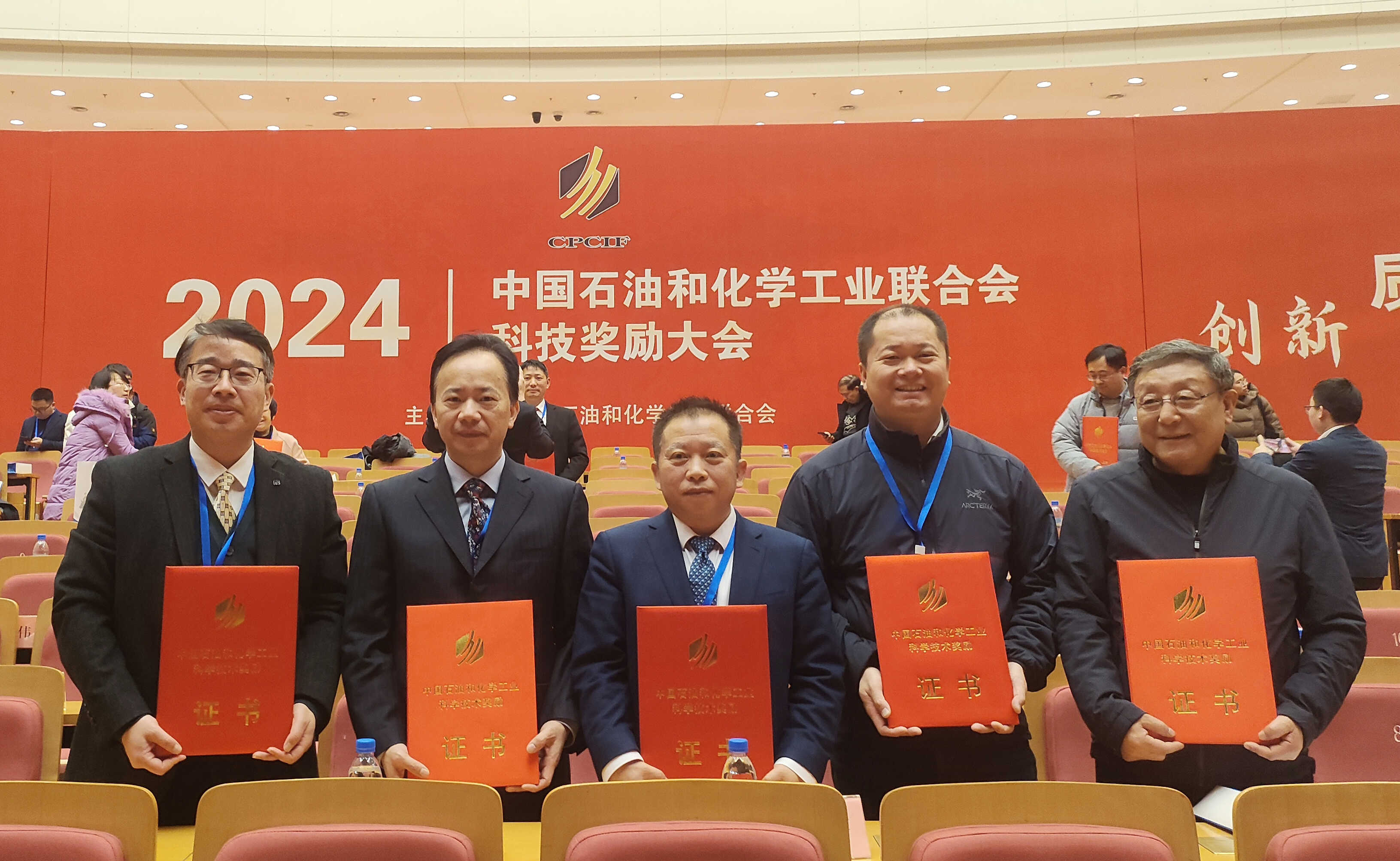 12月30日,2024年中国石油和化学工业联合会科技奖励大会在北京召开。大会隆重表彰了2024年度我国石油和化工行业科技创新的获奖单位和个人,大连化物所所长刘中民,科研及职能部门相关人员,以及陕西延长石油(集团)有限责任公司、延长中科(大连)能源科技股份有限公司等合作企业代表出席会议。大连化物所朱文良研究员、刘中民院士主持完成的“二甲醚经乙酸甲酯制乙醇技术”项目荣获2024年中国石油和化学工业联合会技术发明奖特等奖,邵志刚研究员团队的发明专利“一种固态聚合物电解质水电解池双极板及其制备方法”荣获石油和化工行业专利奖金奖?;嵘?,刘中民受邀作特等奖专题报告。