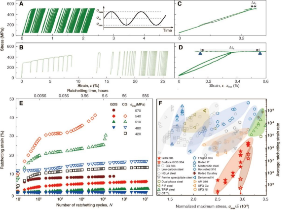 疲劳是金属材料最主要的失效形式之一,尤其在承受循环应力或交变载荷的工程结构中更为突出。疲劳失效通常在应力水平远低于材料屈服强度时发生,具有突发性和隐蔽性,对工程安全构成严重威胁。其中,循环蠕变(棘轮效应)是一种更严重的疲劳变形现象,表现为非对称应力循环与非零平均应力导致的循环塑性应变单向累积,最终引发不可逆转破坏。传统高强度材料常伴随循环软化和应变局域化,二者耦合加剧棘轮效应,加速构件过早疲劳失效。因此,提高高强度金属材料的抗循环蠕变损伤能力一直是材料工程领域的一项重大挑战。