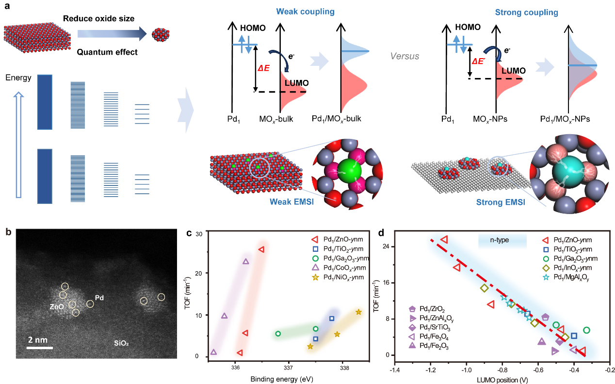 本工作在此基础上,创新性地将前线分子轨道理论(FMO)引入到单原子催化剂设计中,并借助原位显微-光电子能谱耦合技术,实现了一系列半导体氧化物负载的Pd1/MOx(M=Zn、Ti、Ga、Co、Ni等)单原子催化剂本征结构、本征电子态、本征能级的实验测量,揭示了单原子-载体轨道能级耦合与反应活性的定量关系??蒲腥嗽崩昧孔映叽缧вΓü谋銶Ox氧化物载体尺寸,实现了Pd单原子电子性质、乙炔选择加氢反应性能的精准调控。构-效关系的定量解析表明,在同类型氧化物载体上,Pd单原子的价态跟活性(TOF)呈现出良好的对应关系,但是在不同氧化物载体上并不能获得普遍性规律。相比之下,借助准原位紫外光电子能谱,科研人员实现了不同氧化物载体LUMO轨道能级的精准测量,并与反应活性关联,在34种Pd1/MOx催化剂(包含14种n型/p型半导体氧化物载体)上获得统一的线性关系。分子轨道理论计算进一步表明,氧化物载体LUMO轨道能级的上升,增强了Pd原子与载体的轨道杂化,显著提升单原子稳定性的同时,也进一步强化了杂化后Pd单原子活性中心与反应分子的轨道耦合,提升反应活性。此外,科研人员通过构-效关系进行筛选发现,Pd1/ZnO-1.9nm具有最佳乙炔加氢反应性能,在活性、选择性、稳定性上都显著优于现有Pd基催化剂。本工作实现了单原子催化剂本征能级的定量解析,首次提出载体LUMO轨道能级作为通用性描述符,实现单原子催化剂的高通量筛选,为从分子轨道理论诠释单原子催化本质提供了实验验证。