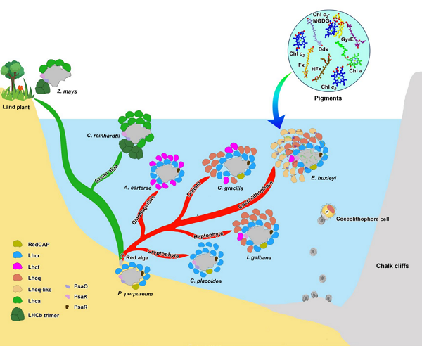 光系统I-捕光天线复合体在光合作用中负责将光能转化为化学能。由于光合生物对不同光环境的适应性,该复合体在结构和大小上呈现显著差异。特别是从海岸带向“陆”和“洋”两个方向的环境适应过程中,光系统I-捕光天线复合体更是经历了深刻的演化??攀迤鹪从诠藕0洞谥猩鞣堆蟛⒋锏椒笔?,对当今全球的气候和生态意义重大。其中,赫胥黎艾氏藻(Emiliania huxleyi)是颗石藻类群中最著名的模式生物,是海岸带生物学中的重要研究对象。因此,赫胥黎艾氏藻光系统I-捕光天线复合体光能利用分子机制的研究对于海岸带生物适应性进化的研究意义非常重大。