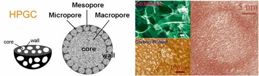 该研究组研究了在多孔炭电极中发生的基本电化学过程(J. Phys. Chem. B 2006, 110, 8570-8575),发现多孔电极的电荷存储能力由多孔结构的离子传输性能(受孔的尺寸、形状及取向等因素影响)、多孔炭的电子导电性以及电解液性质和电解液与炭材料之间的物理化学相互作用等因素所决定。据此他们提出将不同尺度孔(大孔-中孔-微孔)以三维网络形式组装,同时尽可能获得局域石墨片层结构的电极材料设计思想。其设计原理是:局域石墨化三维层次多孔结构(HPGC结构)可充分利用大孔结构作为准体相的电解液储存池以缩短离子扩散距离,中孔结构提供快速的离子输运通道,大孔-中孔协同作用可实现电解液离子在多孔炭电极中的准体相快速扩散行为;微孔的高静电吸附容量赋予优异的电化学储能活性;局域石墨片层则能够提高材料本体的电子导电性(参见图1)。HPGC结构可有效增加离子可利用的电化学活性表面积和电化学活性,并显著降低大电流导致的电位极化,从而获得在高倍率条件下高能量/高功率密度的电化学能量存储与转换能力。