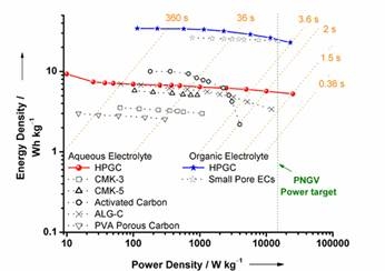 HPGC结构的诸多特点,使其制备十分困难。为此科研人员提出了采用液相无机模板方法,制备出具有上述大孔-中孔-微孔三维层次孔结构和局域石墨片层结构的HPGC材料。实验结果证明,HPGC材料比活性炭和有序介孔炭材料具有更加优异的高倍率电化学能量存储与转换能力。优异的高倍率储能性能在水系和有机系电解液中均能实现,该性能超过美国提出的PNGV((the Partnership for a New Generation of Vehicle)功率指标(参见图2)。如果进一步提高电解液的工作电压,在保持优于PNGV功率密度指标的同时,还可望实现更高的能量密度。这些结果表明局域石墨化三维层次多孔结构炭材料有望成为电动汽车超级电容器用优良的电极材料。