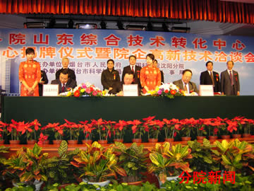 3月31日,由中科院沈阳分院、山东省科学院和烟台市人民政府共同建立的“中科院山东综合技术转化中心烟台中心”揭牌仪式在烟台举行。中科院副院长施尔畏、副秘书长邓麦村、院地合作局局长戚强、沈阳分院院长王庆礼、山东省科学院院长王天义、山东省科技厅副厅长王家利、烟台市常务副市长郝德军、市人大副主任刘筱杰、副市长张广波出席了揭牌仪式。
